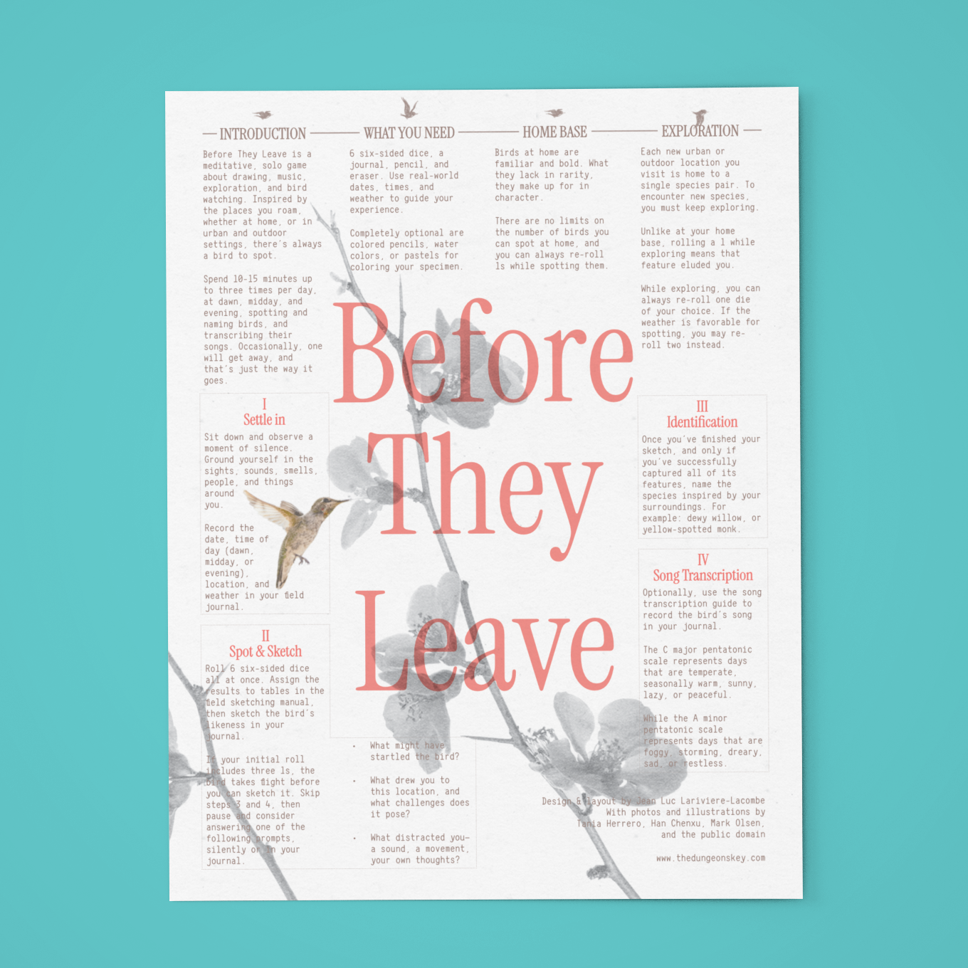 Before They Leave is a meditative, solo game about drawing, music, exploration, and bird watching. Inspired by the places you roam, whether at home, or in urban and outdoor settings, there’s always a bird to spot.